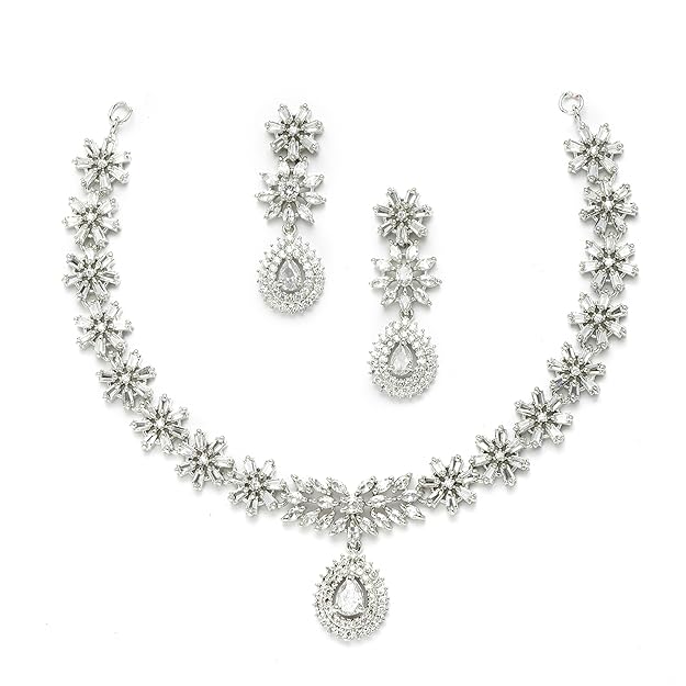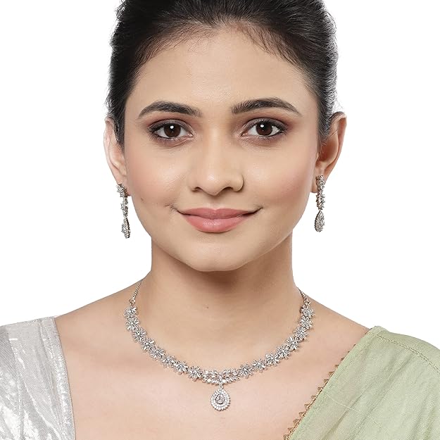 Item type name Rhodium-Plated with Silver-Toned Floral Design White American Diamond Studded Jewellery Set